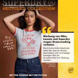 Im Rahmen des Vorgehenes gegen Greenwashing hat die britische Werbeaufsichtsbehörde Advertising Standards Agency festgestellt, dass die grossen Marken Nike, Superdry und Lacoste in diesem Jahr in Google-Anzeigen übertriebene und nicht belegte Aussagen zu den angeblichen Umweltvorteilen ihrer Kleidung gemacht haben.