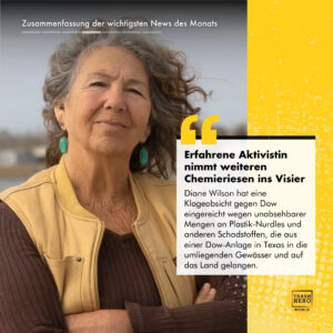 Die renommierte Goldman-Preisträgerin Diane Wilson hat die Absicht erklärt, den Petrochemie-Giganten Dow zu verklagen, weil ihre Organisation unzählige Mengen an Nurdles (Plastikpellets) und andere Schadstoffe festgestellt hat, die aus dem Werk in Seadrift, Texas, in die umliegenden Gewässer und Gebiete gelangen.