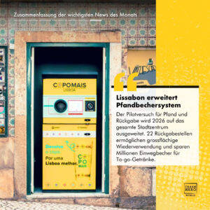 Der 2025 in Lissabon getestete Pfandbecher-Service CopoMais wird im ersten Quartal dieses Jahres im gesamten Stadtzentrum eingeführt. Damit gehört Lissabon zu den ersten europäischen Städten, die grossflächig Mehrweg ermöglichen. So werden Millionen Einwegbecher für To-go-Getränke eingespart. Die Initiative ist das Ergebnis einer Zusammenarbeit zwischen der Stadtverwaltung, einem Unternehmen für Kreislaufwirtschaft und dem Verband der portugiesischen Hotel- und Gastronomiebranche.